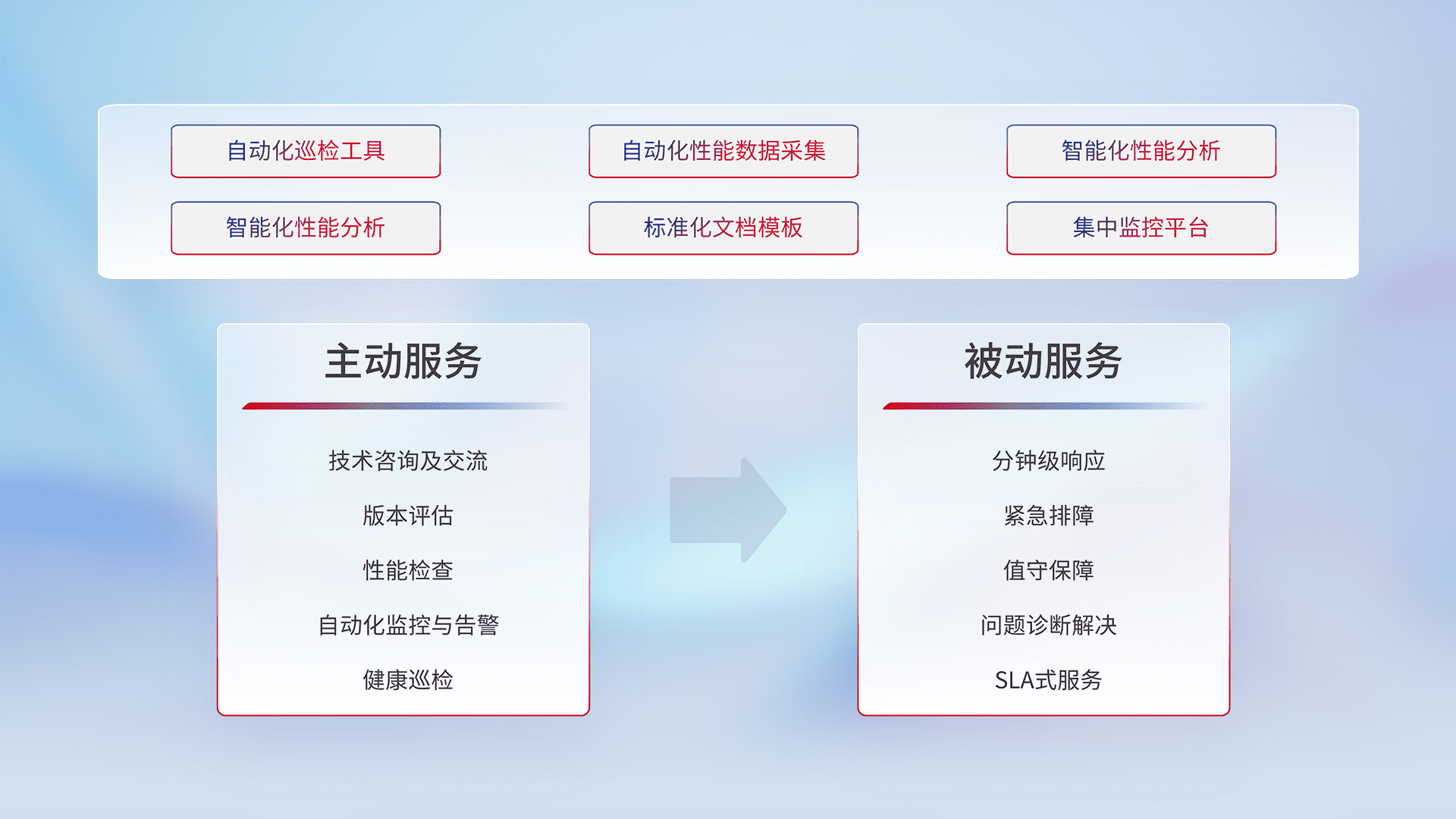 智能化工具和标准化文档,,保障服务质量,,提供主动服务(包含技术咨询、、、、版本评估、、、、性能检查、、、、自动化监控与告警、、健康巡检)和被动服务包含(分钟级响应、、紧急排障、、、、值守保障、、、、问题诊断解决、、SLA服务)。。。